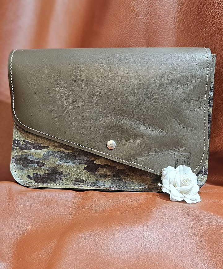 Ce sac à main en cuir véritable est une création artisanale unique, entièrement réalisée à la main dans mon atelier de Draguignan. Avec son rabat en cuir lisse kaki et sa touche imprimé “Militaire” il incarne l’alliance parfaite entre élégance et originalité.